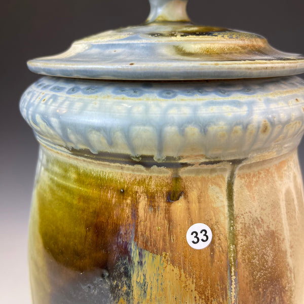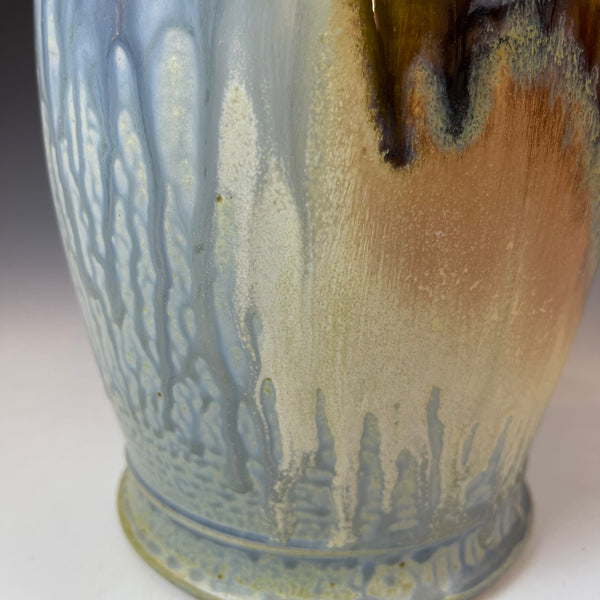 This piece is glazed with a blue ash glaze and accented with tenmoku and a rutile wash. It was fired to cone 10 in a gas reduction kiln.