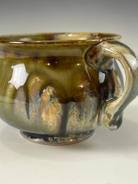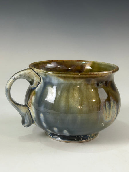 The glaze is a blue ash with tenmoku and rutile stain. Mug was fired to cone 10 in reduction.