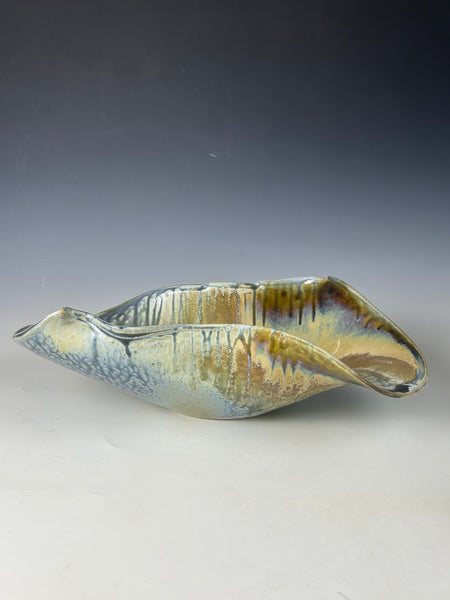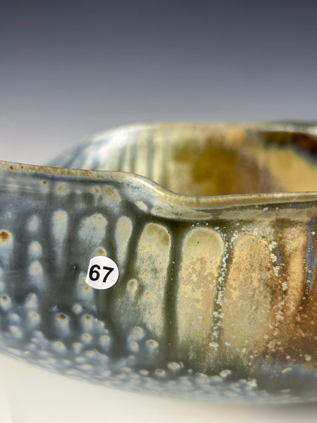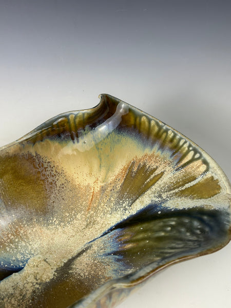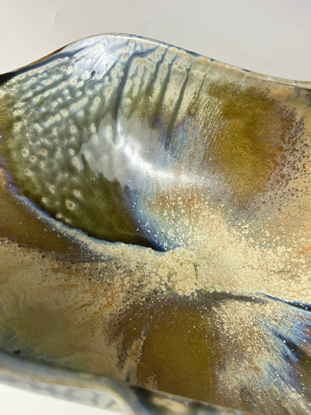 The glaze on this bowl starts with a blue fake ash as its base. Then tenmoku and rutile stain are sprayed separately on different areas of the bowl. This piece is made from white stoneware and fired to cone 10 in reduction.