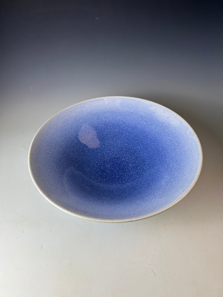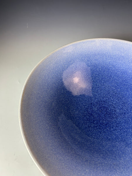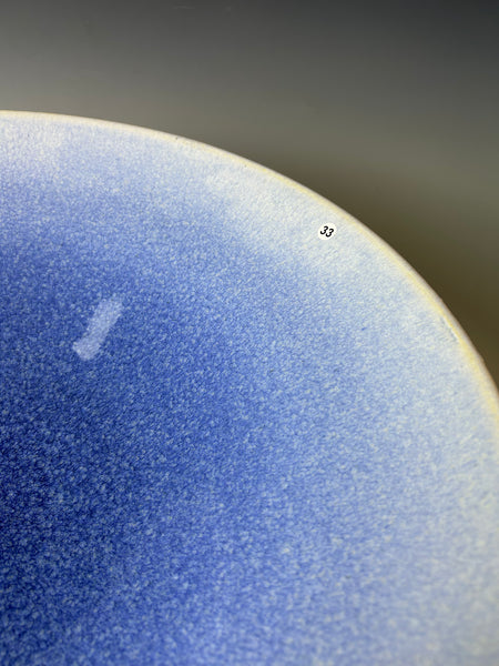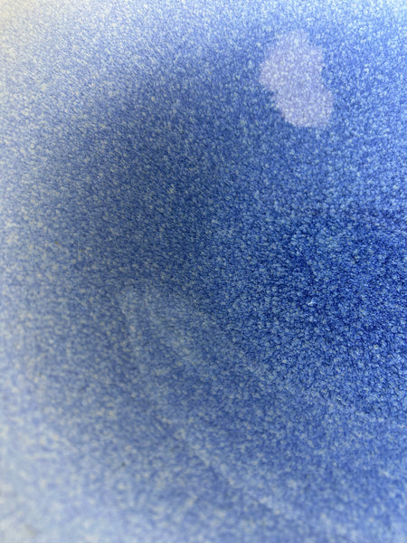 The glaze is my white liner with a trash glaze sprayed over it. A trash glaze is made up of many glazes all poured together and can not be duplicated. I call this glaze combination Grandma's Blue. My Grandma actually loaned me money to build my first gas kiln and kiln shed. She was very supportive of me. She loved blue. Even after macular degeneration when she could only make out shapes I would show her a pot and she would ask, and proclaim, "Is it blue, I love blue". I like calling it this cause it makes me think of her.
