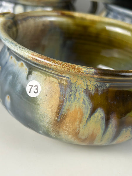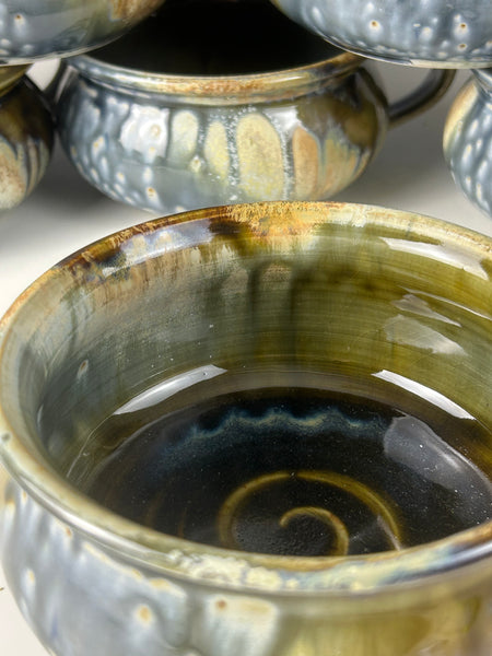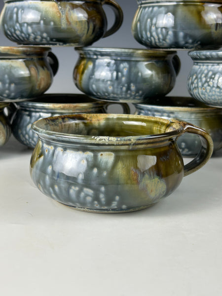 The soup bowl holds a healthy portion.  The blue ash glaze and iron staurate oversprays swim around the surface to create a watery world.  This work is microwave and dishwasher safe.  As with all ash glazes each piece will vary in its own unique manner.