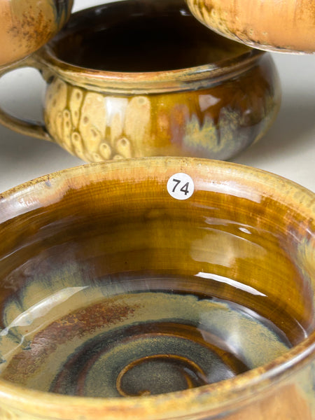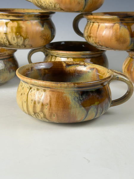 The soup bowl holds a healthy portion. The tan ash glaze and iron staurate oversprays swim around the surface to create a watery world. This work is microwave and dishwasher safe. As with all ash glazes each piece will vary in its own unique manner.
