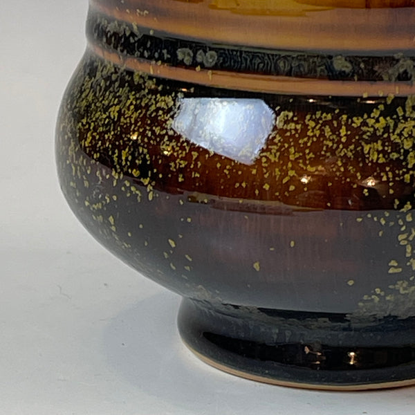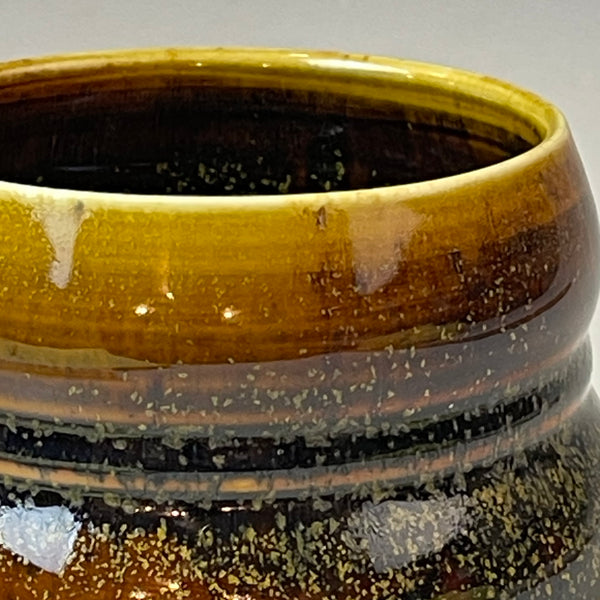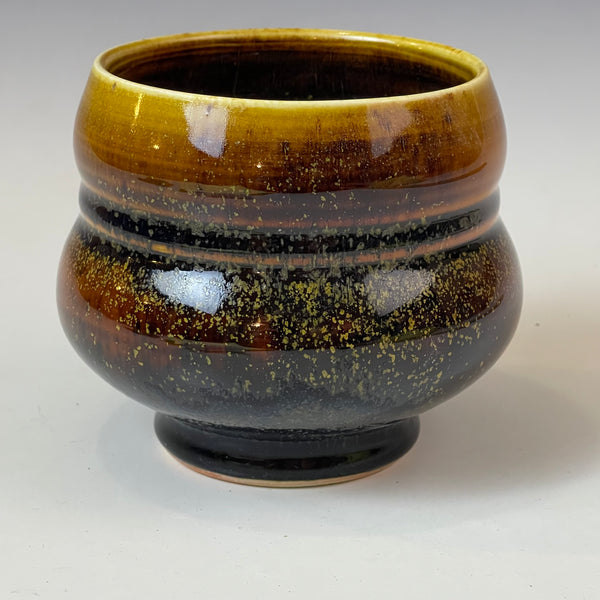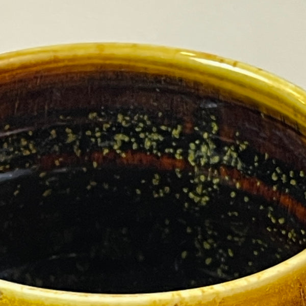 This tea bowl is wood fired for a week in an anagama. The black and amber tenmoku glaze is perfectly covered with tea dust. Made from english porcelain.