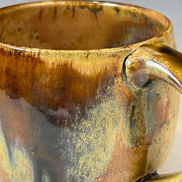 The glaze is a tan fake ash with tenmoku glazes and rutile stain sprayed over it. Mug was fired to cone 10 in reduction.