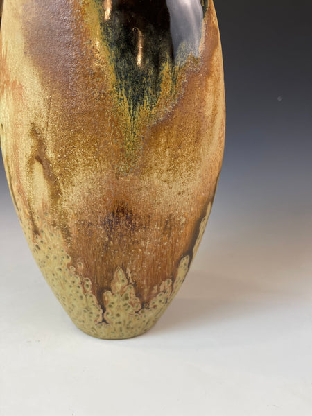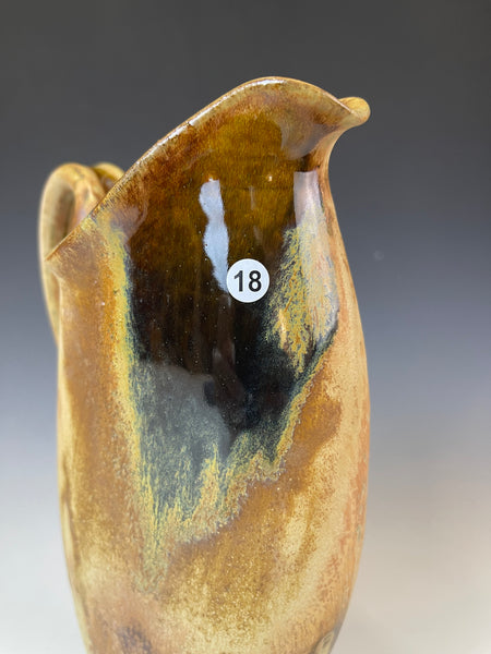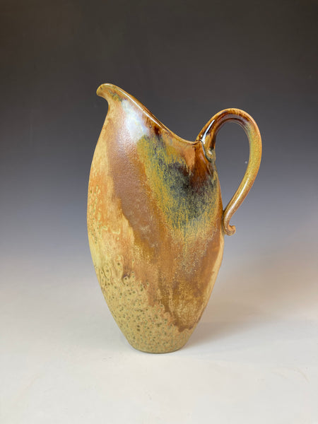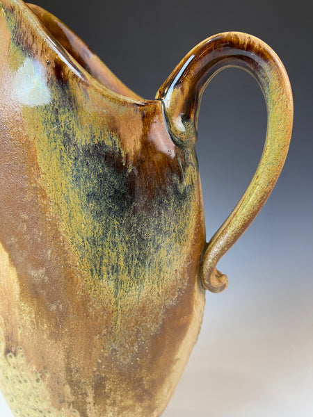 The spout and handle of this pitcher really accentuate it's oval shape. The tan ash glaze with tenmoku and a rutile stain make this piece very elegant.